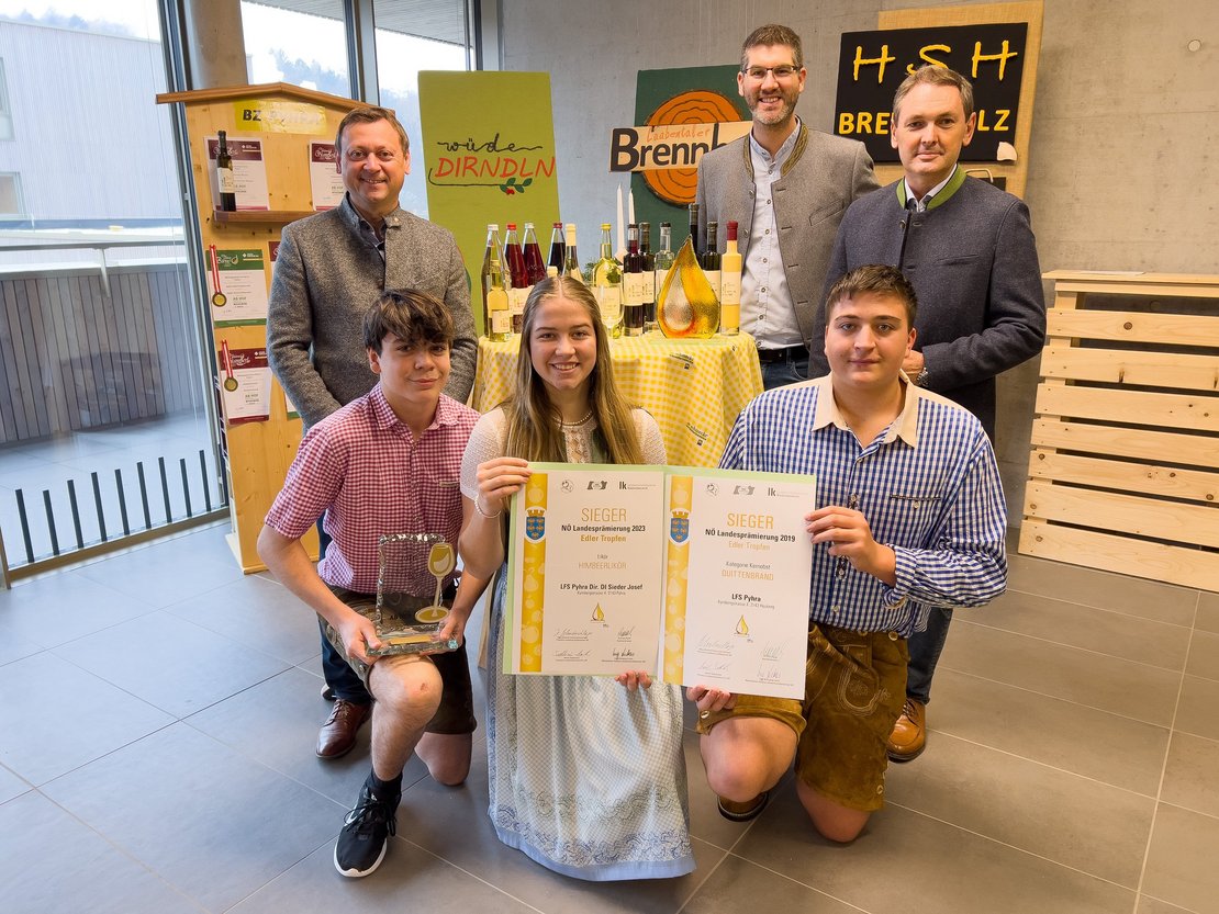 © LVDV NÖ Die Edelbrände in der Fachschule Pyhra werden aus hochwertigen Rohstoffen erzeugt. Für den natürlichen, harmonischen Geschmack und die Qualität ist ein vollreifes Obst und eine moderne Destillationsanlage erforderlich. Die LFS Pyhra, vertreten durch Johann Schiefer, konnte bereits einige Auszeichnungen ergattern. Dieses Jahr erhielten sie bei der Ab-Hof-Messe das „Goldene Stamperl“ für den Tresterbrand und den Himbeerlikör. Insgesamt werden 12 verschiedene Fruchtarten zu Edelbränden und 5 weitere zu Likören verarbeitet, die je nach Saison variieren können. Hauptsächlich werden die Obstsorten Äpfel, Birnen, Zwetschgen, Dirndl, Kirsche, Mispeln und Himbeeren an der Schule selbst angebaut und verarbeitet, teilweise wird für die Produktion auch aus der Region zugekauft.